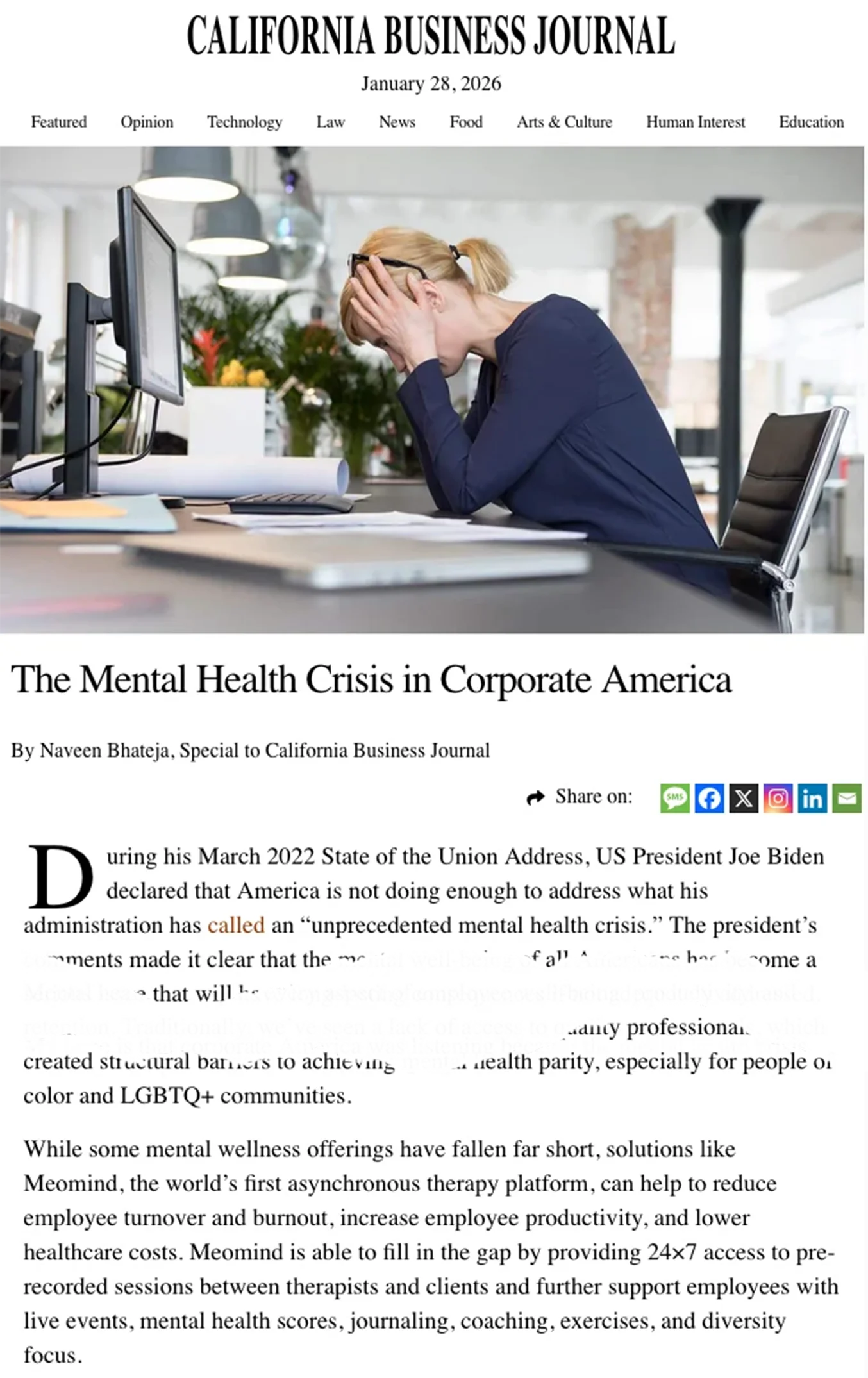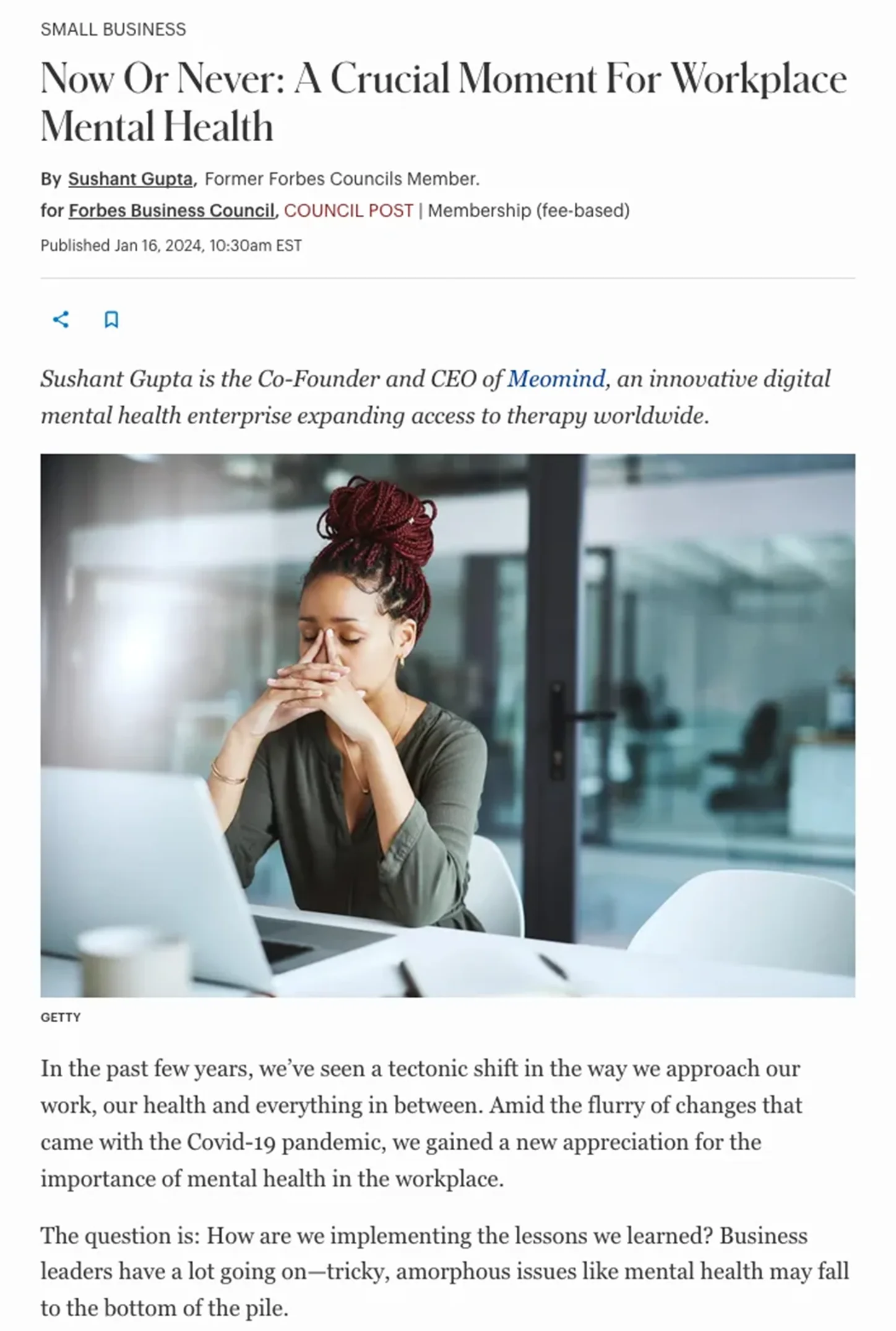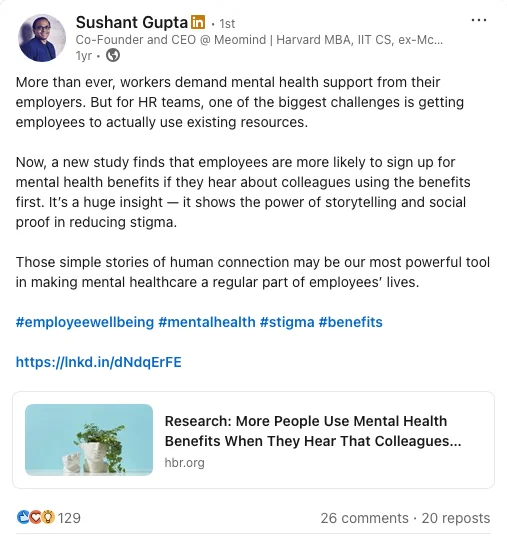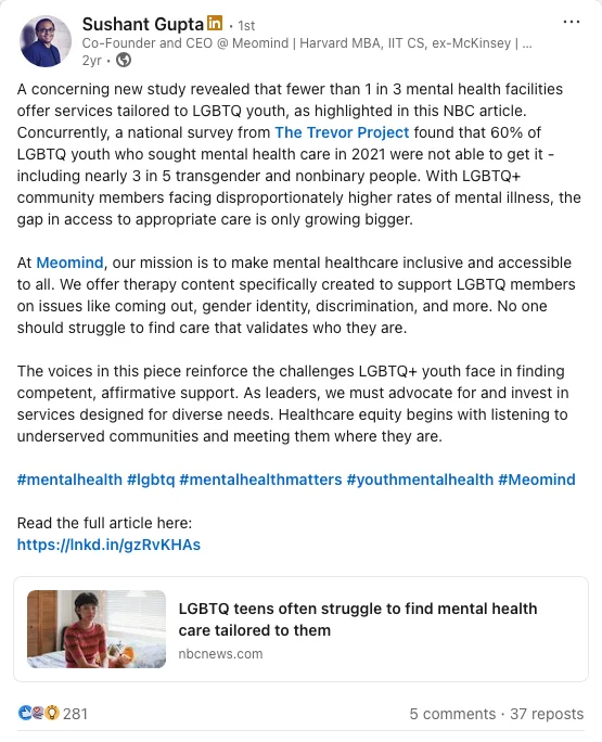 I positioned Sushant, Meomind’s Founder & CEO, as a thought leader in mental health tech. I wrote LinkedIn posts and articles on platforms like Forbes Business Council.